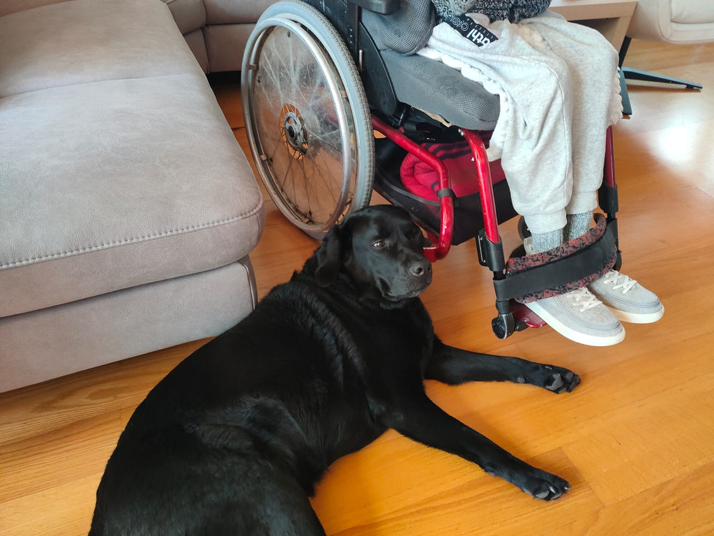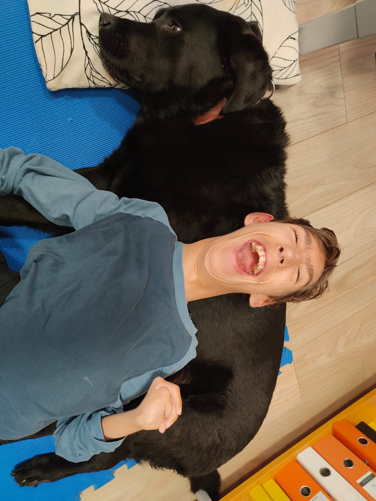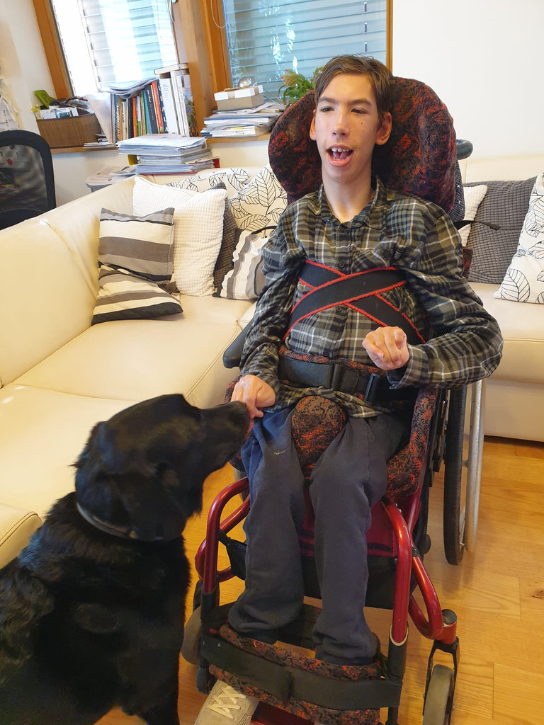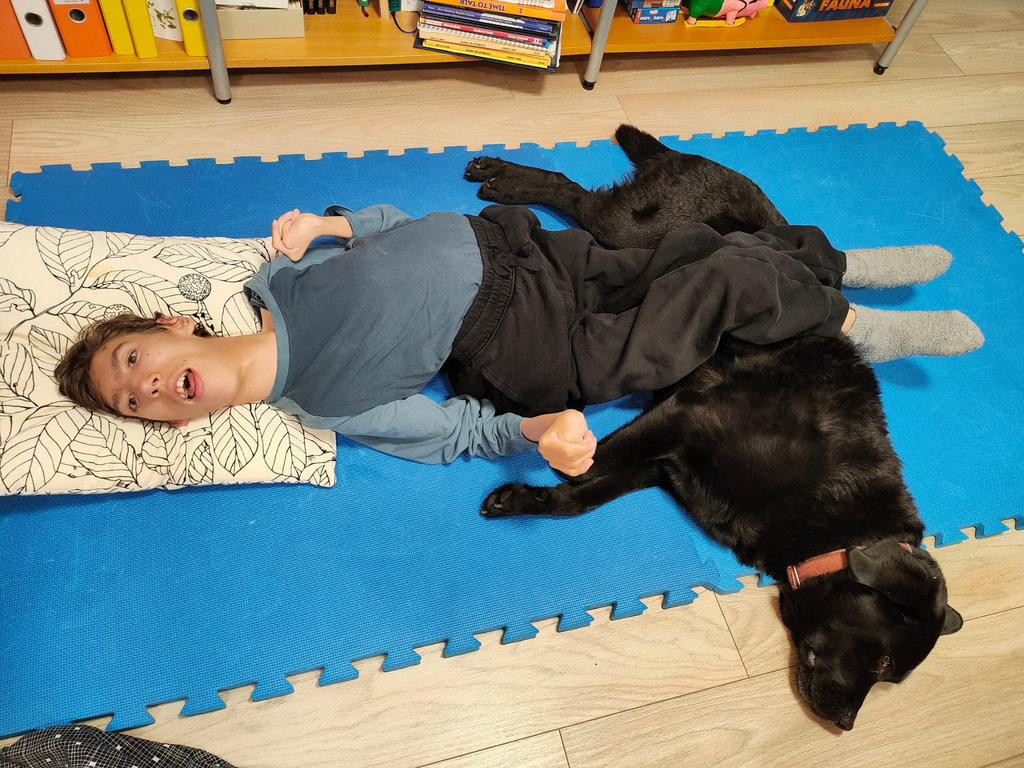 Bohužel Ondra má stále větší potíže s deformací páteře a zvětšujícím se zahleněním. Používáme speciální zatvrzovací ortézu pro sed Flexiform a také používáme „kašlacího asistenta“ na odhlenění. Aaron je pořád pro Ondru nejlepším parťákem, olizuje mu ruce, leží mu u nohou vozíku při sledování televize. Polohování, i když není úplně pravidelné, si Ondra vždy moc užívá. Aaron je velmi trpělivý a rád Ondrovi u polohování „asistuje“.