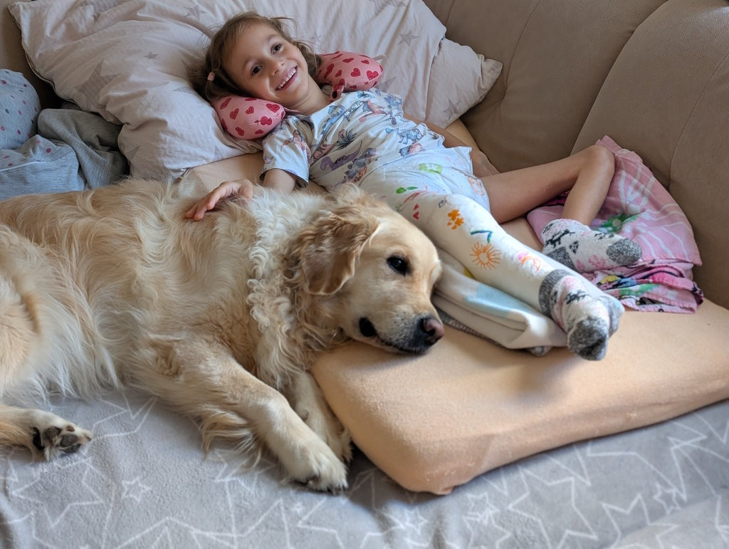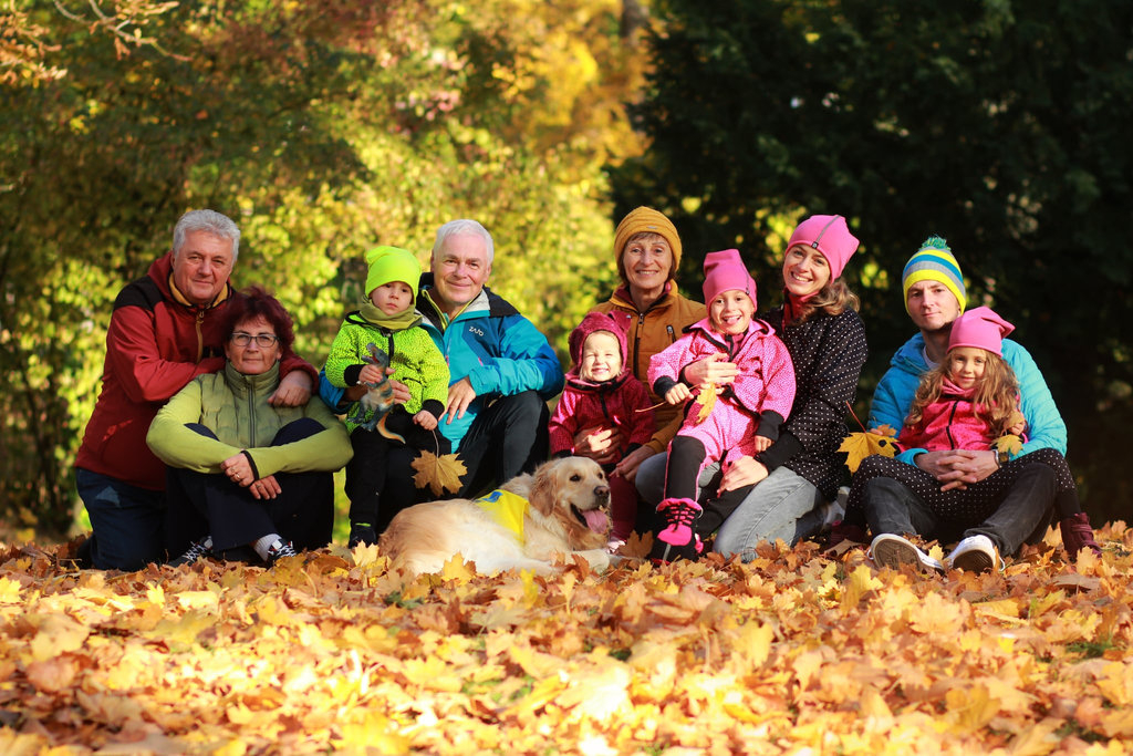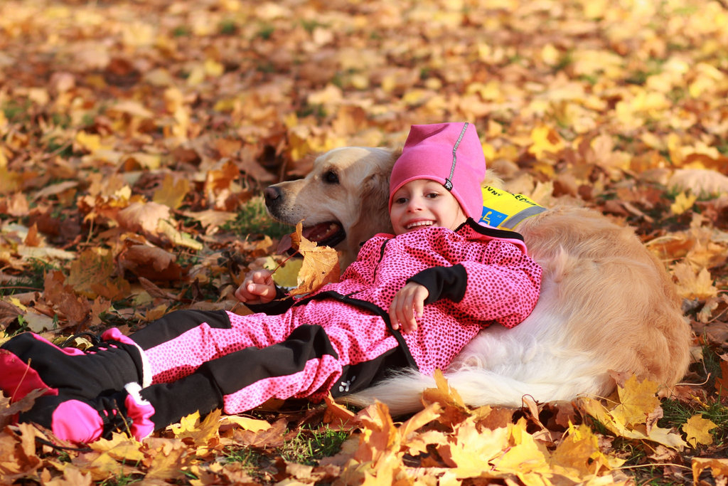 Nikolka na začátku září podstoupila operaci druhé kyčle a opět byla zasádrovaná od pupíku po patičku. Následující dva měsíce s naším „sádrovým trpaslíkem“ byly opravdu náročné. Chanelka nám moc pomohla a snažila se Nikolku udržet veselou, jak jen to šlo. Opět jako deja vue proběhlo srdečné setkání těch dvou po příjezdu z nemocnice, akorát s ročním odstupem. Chany dostala povolenku válet se s Niky na gauči. Chodili jsme na dlouhé procházky, užívali podzimu. No a protože bylo všude tak krásně barevno, poprosila jsem kamarádku, aby nám udělala pár fotek. Udělaly nám opravdu radost.