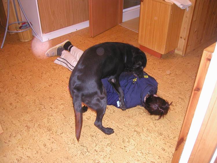 Zajímavé foto z výcviku, kde kromě podávání berle, Elvis nacvičuje první pomoc při epileptickém záchvatu. Když klient upadne na zem, Elvis ho musí otočit na bok, či záda, aby se klientovi lépe dýchalo.