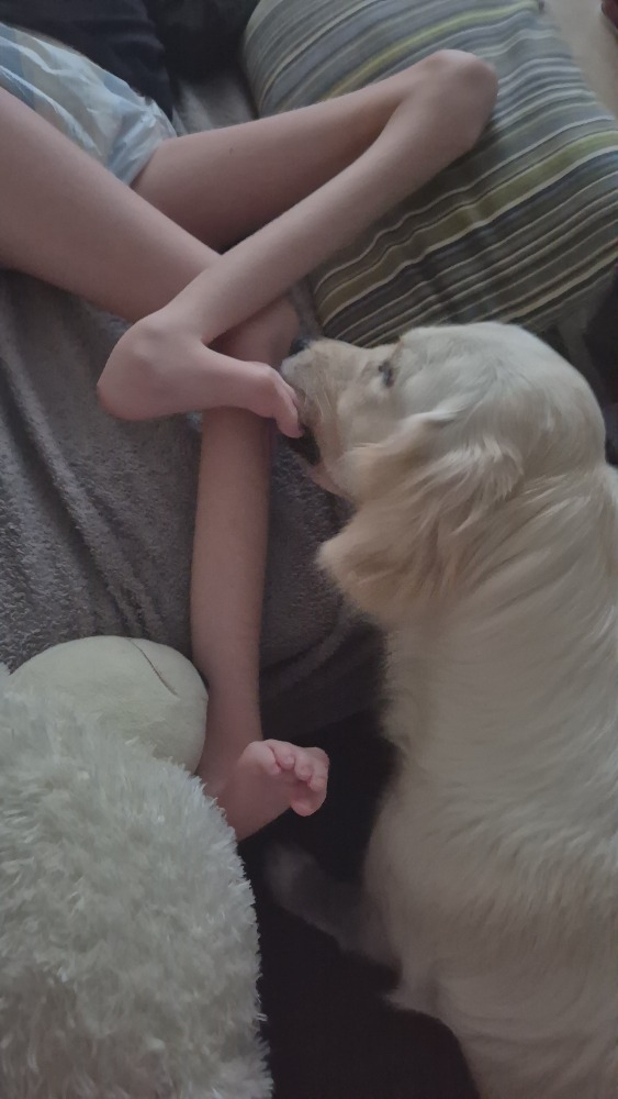 Poznala svůj nový domov a ani tady nebyl žádný zádrhel. Poznávání okolí, nových pachů, registrace u nového veterináře atp, to vše proběhlo naprosto bez problémů. Marci stále nadšeně olizuje (masíruje) Kačenku, prohřívá její spastické tělíčko, sundavá ponožky ( to miluje i Kačenka a úplně se u toho řechtá smíchy) a zvedá jí svou přítomností náladu.