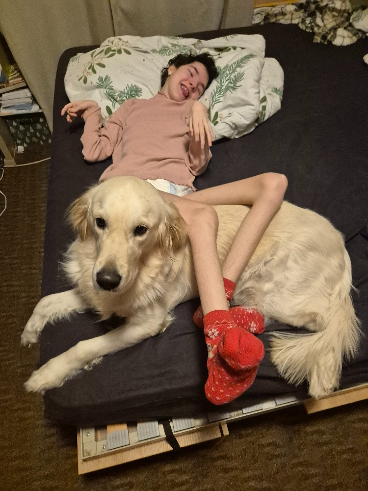Již při pobytu jsem měla pocit, že tak jako tenkrát u Eminky, přeskočila ta pomyslnná jiskra i u Marcinky. Od Kačenky se téměř nehnula, pořád ji sama od sebe olizovala ručičky či nožičky, vždy poznala,která strana je více spastická a k té si lehla. Čekala až se Kačenka přemístí z postele a hned nadšeně pracovala.