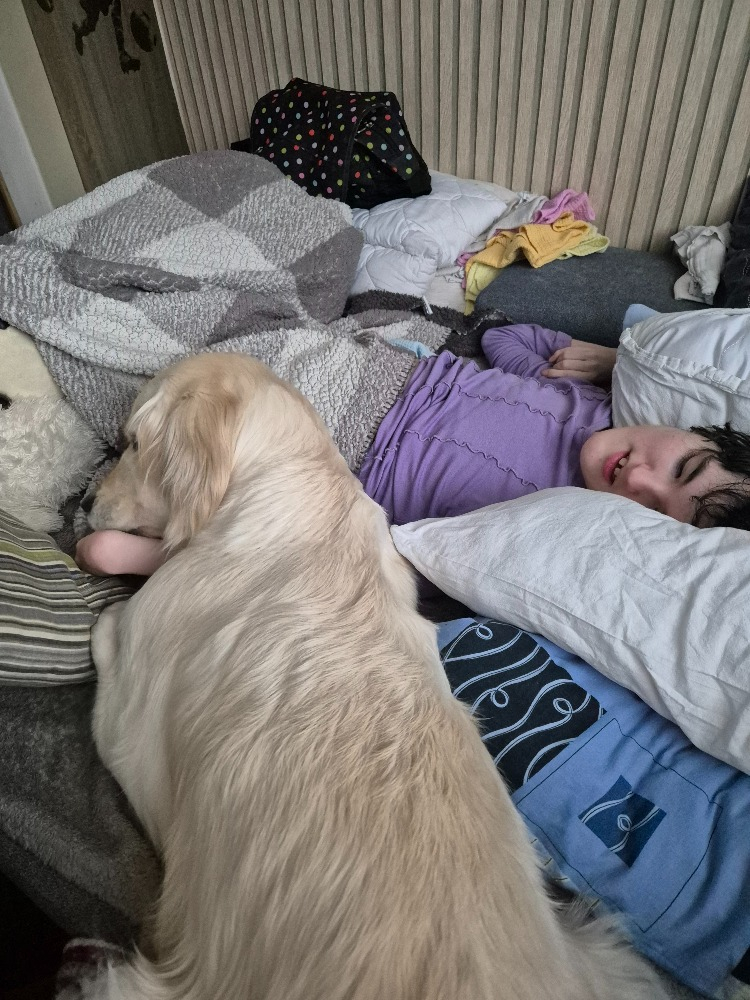 Když nám v únoru zemřela naše první asistenční fenka Emie, hodně nás to zasáhlo a nejvíc naší těžce postiženou dceru Kačenku. Hodně se nám zhoršila po psychické stránce. Byla plačtivá, takový ten "bolavý" pláč, který se nám nedařil uklidnit. Byla mrzutá a málokdy se na nás usmála. Možná i vlivem smutku se jí po dlouhé době objevil epileptický záchvat.