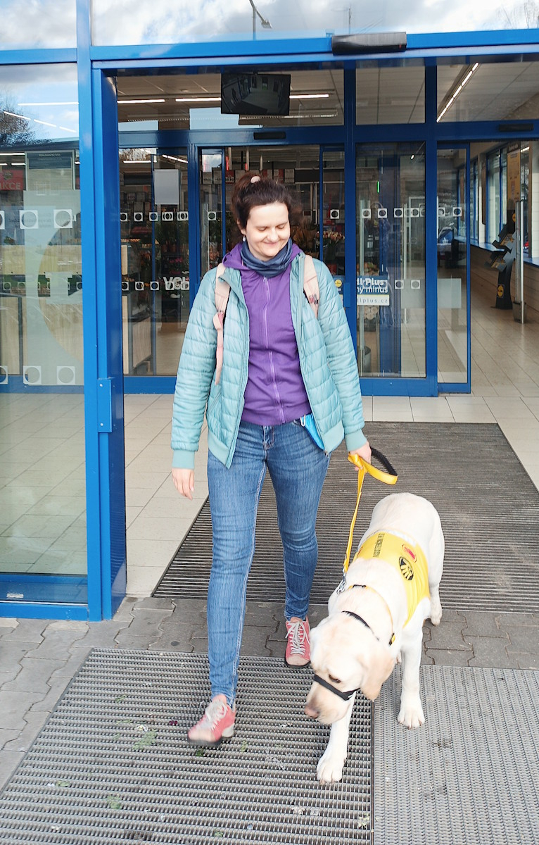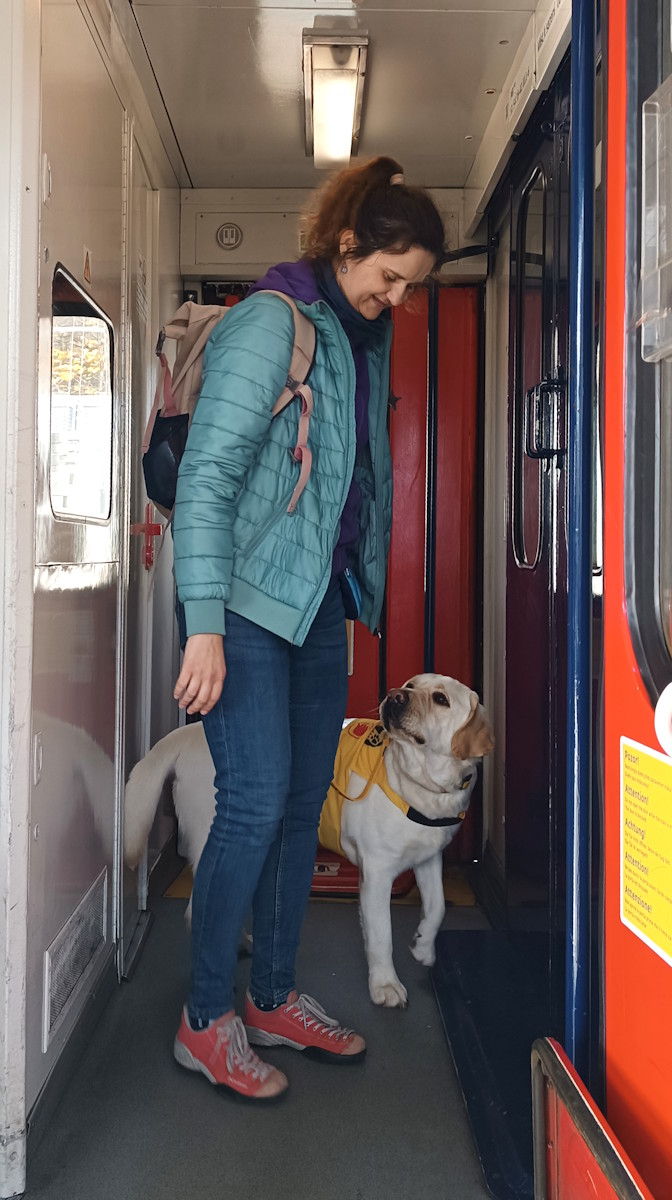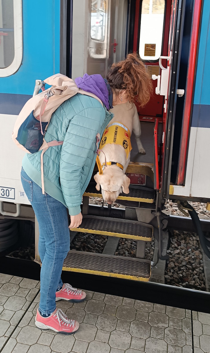 Oba se přesunuli do bydliště Zuzky. Paní Zuzana bude s Ozzym dojíždět do zaměstnání vlakem a MHD, proto se protrénovalo i náročné nástupy a výstupy z vysokého vlaku z ošklivými drátěnými schody.