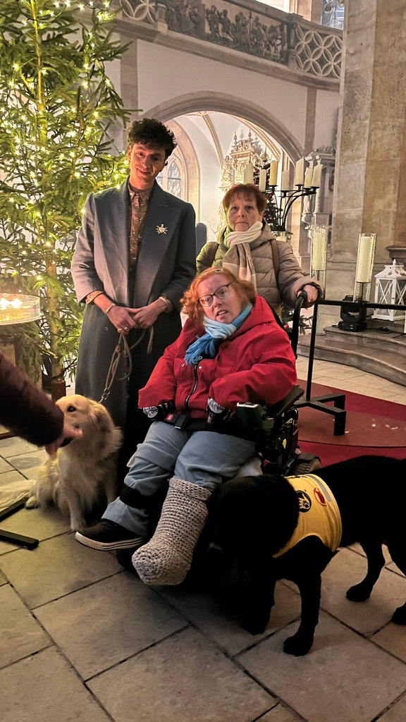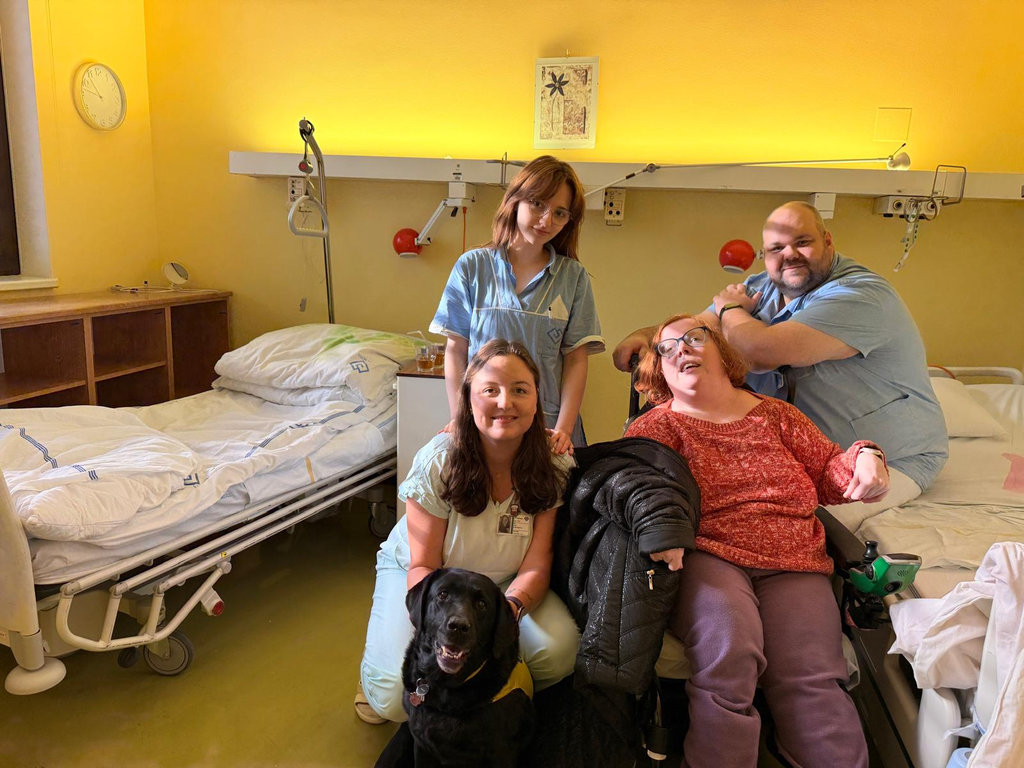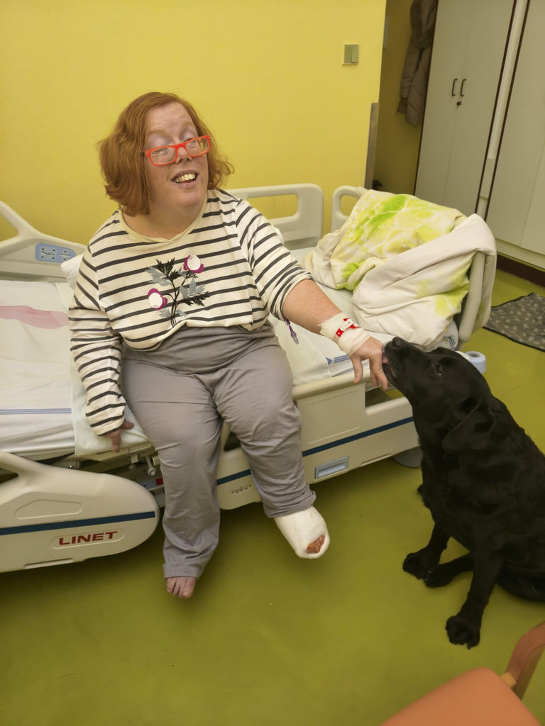 Další poděkování je vedení Fakultní nemocnice Motol a Klinika dětské a dospělé ortopedie a traumatologie 2. LF UK a FN Moto. Moc děkuji, že jste mi ve dnech 24. – 28. 11. 2025 umožnili hospitalizaci s asistenční fenkou Vandou a maminkou. Děkuji za skvělou péči personálu a za vlídný přístup. Velmi si toho vážím. Vandička mi hodně pomohla psychicky. Hned první den po operaci i fyzicky, když jsem seděla na posteli, lehla si pod operovanou nohu a pomáhala od bolesti. Musím říct, že i když to teďka má Vandinka s asistenční u mě ztížené, protože se nesmím opírat o operovanou nohu, poradila si s tím bez mrknutí oka a zvládá vše s naprostým přehledem. Dokonce mi dnes podala povlečení. Umí podat i držák koše na hranolky do horkovzdušné fritézy. A lahvičku s želatinovými vitamíny.